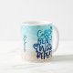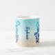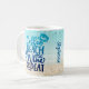 This fun summer coffee mug features text image "Coffee Beach Wine Repeat" in blue ombre glitter on a beach watercolor background. Add your name along the side to personalize, or delete name for a clean look.