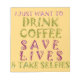 Introducing our playful “Funny Coffee Selfie Quote Design,” a vibrant and humorous piece that captures the essence of coffee lovers and selfie enthusiasts! Featuring the catchy phrase, “I just want to drink coffee, take selfies, and save lives,” this artwork is designed in bold red and lemon green typography against a sunny orange-yellow background, making it a perfect statement piece for any coffee lover.