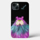Cute cat lovers iPhone 13 case done in black, with graphics of a funny colorful cat, on the bottom half, of the case. Personalize the aqua text, as a great gift idea for her.
