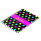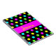 Graphic design of colorful polka dots on a black background with a bold pink stripe on it, where you can write your own name.