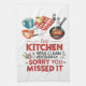 Add humor to your home with this playful kitchen towel featuring the witty phrase, “The Kitchen Was Clean Yesterday, Sorry You Missed It.” Illustrated with a frying pan, mugs, spices, and essential kitchen utensils, this charming artwork captures the beautiful chaos of everyday cooking. Perfect for home cooks, food lovers, or anyone who knows that mess is just part of the magic. A fun and relatable statement for kitchens full of flavor and laughter.