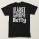 This design is meant to be personalized with the name of your BFF, buddy, spouse, or partner. It pairs perfectly with our 'I Am Betty' shirt. Don't get lost when you're on the road. This humorous design is perfect for a wedding gag gift, pairs costume, or bon voyage gift. It's suitable for black and dark-colored backgrounds. Easily customized by changing "Betty" to any other name. Design tip: size personalized text to slightly wider than "RETURN TO."