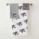 This great set of towels feature a fun cartoon illustration of a black and white cow. On the bath towel, the cow is tiled in a pattern on a white background. On the hand towel the cow is on the bottom right on a light gray background. On the washcloth the cow is on the bottom right on a medium gray background.