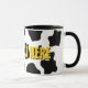 Funny Cow print coffee mug | Personalizable text. Cute gift idea for men women and kids. Black and white animal pattern with yellow letters.