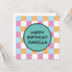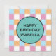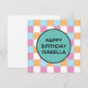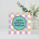 Cool, blue, orange white, and pink checkerboard pattern and a text template. To edit, click personalize and change the words.