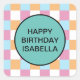 Cool, blue, orange white, and pink checkerboard pattern and a text template. To edit, click personalize and change the words.