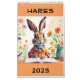 Cartoon type images of hares depicting each month of 2025. Relevant images to the month, i.e. Red hearts for Valentine's Day in February, 4th July celebration for July, Thanksgiving for November, Christmas Tree for December etc.