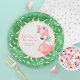 Cute pastel floral baby girl shower paper plate with a funny pink flamingo bird with a floral arrangement of watercolor blush pink flower blooms bouquets and big green palm leaves.
