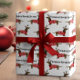 Cute, modern Christmas gift wrap, featuring the pun, "Daschund through the snow" with Dachshunds (aka wiener or sausage dogs) wearing red Christmas sweaters and antlers.