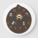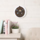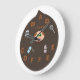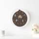 This awesome clock features a cartoon of a Dad who is a coffee monster. His face is inside a big droplet of coffee and he has a creepy tongue and is starting to go bald. Sugar, milk, coffee and a spoon surround him, everything he needs for his favorite drink. The light brown text says, “Dad loves coffee”.