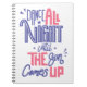 This fun dancing notebook features the quote "Dance all night until the sum comes up" printed in fun fonts in shades of pink and navy blue highlighted against a crisp white background.