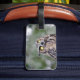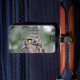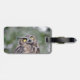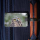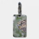 A luggage tap featuring a wide-eyed great horned owl. Personalize this luggage tap with the contact information of your choosing, such as your name, phone number, and/or email address, and use it on your next vacation.