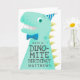Funny and cute birthday card for a special boy! Cartoon style illustration of a green dinosaur with yellow spikes. The t rex is wearing a blue bow tie and a tiny party hat. On his body there is a text that says "Have a DINO-MITE birthday" You can add the birthday boy's name under that. Text is easily editable online.