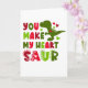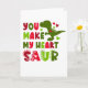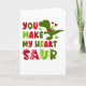 A green dinosaur, pink and red hearts and colorful text reads: You Make My Heart Saur.