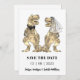 Delight you guests with this funny dinosaur themed wedding T Rex bride and groom save the date. Easy to customize with the bride and grooms names and the wedding date. Fun watercolor T Rex bride and groom illustrations with modern typography. Unique original artwork by artist Catherine Sweetman