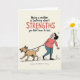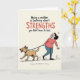 This card features a light cream background with a funny, relatable scene that feels like a shared everyday moment between two companions ❤️. Across the top, a motivational line sits centered, with most of the words in dark lettering while the key word “STRENGTHS” appears in bright red to draw the eye. In the lower right, a woman with dark hair swept back is pulled forward on a leash, her face tightened into a determined grimace as if she’s trying not to laugh and groan at the same time. She wears a coral-pink top and blue trousers, leaning back with her feet braced, giving the scene a friendly, “we’re in this together” kind of closeness. Ahead of her, a tan dog trots confidently with its tongue out, tail suggested in a happy wag, looking delighted and utterly unconcerned. Beneath the main illustration, a smaller line of text sits near the bottom in a lighter, celebratory tone, adding a gentle flourish 🌼. The figures are drawn with simple outlines and minimal shading, and the leash angles diagonally from the woman’s hand to the dog’s collar.