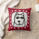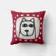 A cute drawn dog in black and white over a red textured background surrounded with white dots.