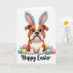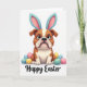 This design shows a stout brown-and-white dog centered on a bright white background, its rounded shape shaded to look smooth and softly sculpted. Oversized long ears in pastel blue and pink sit on its head like costume accessories, giving it a dressed-up look that feels a bit like a friend trying to be cute for you 🐰. The dog’s wide dark-blue eyes and slightly reluctant expression create a tender, teasing contrast, like it’s posing for someone it cares about. At its feet, glossy egg-shaped decorations with polka dots cluster in soft pink, warm yellow, and gentle blues, adding a springtime feel 🌷. The lighting is crisp and even, making the dog and the eggs look almost three-dimensional with a subtle shine. Along the bottom, a flowing line of greeting text sits centered in a dark tone, standing out clearly against the white space without crowding the artwork. The pastel blue-and-pink ears arch upward while the dotted eggs gather in a loose semicircle around the dog’s paws.