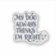 Show off your dog-loving sense of humor with this playful sticker. Featuring the phrase "My Dog Always Thinks I'm Right", this sticker is perfect for dog parents who know their furry friend has their back—always. Ideal for decorating laptops, water bottles, notebooks, or car windows, it’s a fun and durable way to share your love for your pup.