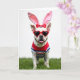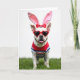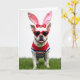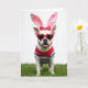 This card shows a light-coated dog centered on a bright white background, standing on a strip of soft-focus green grass with a friendly, slightly flirty tilt to its head. Tall bunny ears in pale pink sit on top, held by a red bow dotted with small white circles, adding a cute Easter touch 🐰. The dog wears red heart-shaped sunglasses with dark lenses, and a tiny tongue peeks out as if it’s sharing a teasing grin with someone just off to the side. A sleeveless shirt with wide red, white, and blue stripes wraps its body, giving the scene a festive, upbeat look. The lighting is even and gentle, bringing out the fur texture, the smooth shine of the glasses, and the soft fabric of the shirt without harsh shadows. Near the top, a short Easter greeting appears in red lettering, spaced above the dog so the portrait stays the main focus 🌷. The white backdrop stays uncluttered while the grassy edge below forms a simple green base under the dog’s paws.