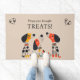 Three stylized cartoon dogs smile at guests, with the saying "Hope you brought Treats!", and a simple heart in the top corners. Great for the dog loving home!