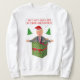 On this humorous Christmas sweatshirt / Ugly Christmas Sweater, US President Donald Trump holds out his hands while emerging from a gift box and wearing a Santa hat with his MAGA slogan on it. He's surrounded by a couple Christmas trees and saying, "My Ugly Sweater is Tree-Mendous!" You can also change the text if you customize.