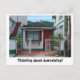 Realtor marketing card "Thinking about downsizing?" with a funny photo of a tiny house between two large houses. Real estate agent direct marketing piece with a sense of humor to solicit new clients who are thinking about selling their home and finding a smaller one. The text is editable and you can add your own text on the back if you like.