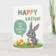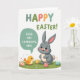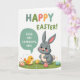This card shows a spring scene where a grey rabbit with extra-long ears and rosy cheeks leans close to a tiny yellow chick, their faces turned toward each other with an easy, friendly closeness 🐰. The rabbit’s open-mouthed grin and big dark eyes make it look like it’s mid-joke, while the chick stands nearby as if listening in. Along the lower area, several decorated eggs in coral, mustard, and aqua sit on a rich green patch of grass, suggesting a casual little hunt. Small flower and leaf shapes are sprinkled around the foreground, adding gentle seasonal detail 🌷. Near the rabbit, a rounded speech bubble holds the phrase “EGGS ARE EXPENSIVE, BRO!” in white lettering. Across the top, “HAPPY EASTER!” appears in large rounded letters shaded in soft greens, oranges, and teals. The illustration uses flat color areas with crisp outlines, keeping everything easy to read. The grass is dotted with tiny blossoms, and the patterned eggs rest beside the rabbit and chick near the bottom edge.
