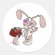 This image shows a cartoon bunny with long ears, a pink nose, and big teeth carrying a basket full of colorful Easter eggs. The playful design makes it a fun and festive sticker for Easter celebrations.