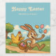 This playful Easter illustration features a cheeky bunny joyfully running away with a basket full of colorful Easter eggs, while a surprised chicken chases after him! Set in a bright, cheerful spring landscape and drawn in a retro cartoon style, this design brings a smile to kids and adults alike. A humorous and light-hearted design for a joyful Easter celebration!