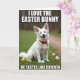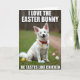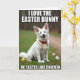 This card shows a fluffy white dog with pointed ears and an open-mouthed grin, its pink tongue visible as it looks straight at you with an eager, friendly gaze. A bright red collar with small metallic tags adds a romantic little “dress-up” touch, like it’s ready to impress a favorite person on a spring day. The scene sits in a green grassy yard dotted with pastel egg shapes, giving a festive Easter feel alongside a small 🌷. In the distance, a softly blurred path and leafy greenery fade into gentle daylight, keeping the focus on the dog’s cheerful face. Across the top, large all-caps text in a simple sans-serif style reads “I LOVE THE EASTER BUNNY,” placed high and centered over the background. Near the bottom, matching all-caps text reads “HE TASTES LIKE CHICKEN,” sitting low and centered beneath the dog like a cheeky afterthought 🐰. The contrast between the sweet spring setting and the unexpected line makes the dog’s grin feel like it’s sharing an inside joke with someone close. Pastel eggs sit scattered in the foreground grass, with soft greens and light tones framing the red collar and white fur.