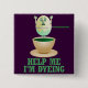 This funny Easter design shows an Easter egg being dipped into a saucer of green dye with a scared look on its face and its arms in the air. The text says, "Help me. I'm dyeing." This is a humorous cartoon for anyone who likes to paint Easter eggs and loves silly puns.