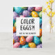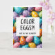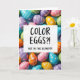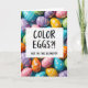 This design shows a tightly packed mosaic of glossy, egg-shaped decorations filling the whole frame, like a close-up wall of spring treats 🌷. The colors run through spring green, sky blue, sunny yellow, soft pink, deep lavender, and orange, and the shine on each surface makes them feel freshly set out for a shared celebration. White patterns—stripes, dots, and small starburst shapes—repeat across the eggs, and the way neighboring colors lean into each other gives the scene a friendly, togetherness feel 🐰. In the middle, a stark white rectangular banner cuts across the busy background, creating a clear focal point. The top line reads “COLOR EGGS?!” in thick black lettering, centered and easy to spot. Beneath it, “NOT IN THIS ECONOMY!” appears in the same black style, also centered, with the strong contrast making the message feel like a straight-faced joke against the sweet setting. Around the banner’s edges, the patterned eggs press in from every side, with crisp white dots and stripes peeking out behind the corners.