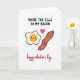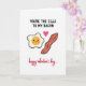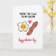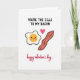 This greeting card features a smiling fried egg and a curved strip of bacon shown together on a white background. The egg sits on the left with a bright yellow yolk shaped into a happy face, complete with pink cheeks and bold black outlines. Beside it, the bacon leans in with streaks of red and brown, giving the pair a cozy, connected look. A small pink heart floats between them, tying the scene together. At the top, the message reads “YOU’RE THE EGGS TO MY BACON” in black, hand-drawn block lettering. Near the bottom, “happy valentine’s day…” appears in red handwritten script, adding a warm sign-off. It’s a lighthearted and affectionate card that celebrates how two people fit perfectly together, making it a sweet choice for Valentine’s Day ❤️💌🍫.