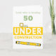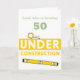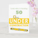 Funny, fifty and under construction happy birthday. Front: Yellow measuring tape, under construction sign, and level. Inside: "Happy Birthday" and "Stud" written on a wooden board.
