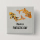 A button with a funny which says: have a fintastic day. Designed with an illustration of a pair of gold koi fish swimming together.