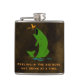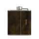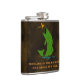 Fun fisherman's custom drinking flask done in an antique brown, with graphics of a green big mouth fish jumping to catch an orange bug. Orange text, on the front reads, Reeling in the big boys, one drink at a time. Personalize the orange text, on the back, for yourself or as a great gift idea to your favorite angler.