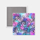 A funny little bird in the upper left corner and floral elements on a pink, purple and turquoise background.