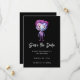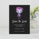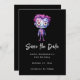 Save the date card with a cute illustration. Frankenstein monster with pink and purple hair and a dapper suit and tie.
