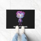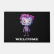 A welcome doormat with a cute illustration. Frankenstein monster with pink and purple hair and a dapper coat and tie.
