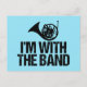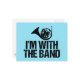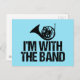 A little French Humor humor gift that reads I'm With The Band under the instrument on a blue background. This cool design makes a funny present for a French Horn player.