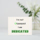 A fun postcard with the text "I'm not obsessed I am dedicated" in black lettering. The O of obsessed is shaped like a computer power button, and the background is a binary repeating pattern of 0's and 1's. For anyone who loves to spend time on their computer.