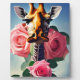 Adorable tabletop art plaque features funny giraffe portrait with big pink roses. Digital painting created with AI generating software.