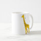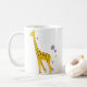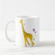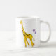 Cute mug with a funny cartoon giraffe nibbling on a violet flower and holding some flowers with its tail while roller skating.