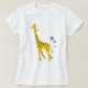 Customizable cute and funny shirt with a cute giraffe nibbling on a purple flower and holding some flowers with its tail while skating with roller skates with wheels made of flowers.