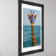 Funny giraffe poster with blue swim goggles in the ocean. Whimsical wall art perfect for animal lovers, kids, or quirky home décor.