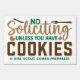Girl Scout funny, sarcastic, cookie soliciting yard sign has, "No Soliciting unless you have cookies, a girl scout comes prepared!". Nice, clear typography with two cookies, a knife, and a fork, in brown, tan, and green. This sign is a perfect eye catcher for your cookie sales table, with it's irony and taunting vibe! *Let me know if you would like other typography text for your girl scout activities, send me a chat message.