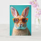 This design shows a close-up portrait of a rabbit 🐇 centered against a smooth teal background, with its head and upper chest filling most of the frame. Its fur mixes warm ginger and soft fawn tones, and the fine hairs look plush where the light catches them. Bright orange glasses sit neatly on its muzzle, adding a friendly, slightly flirty look as if it’s dressed up for a sweet springtime photo. Through the clear lenses, dark curious eyes glance forward with a gentle, inviting focus, like it’s quietly sharing a private moment with the viewer 🌷. A small pink nose and a fan of pale, translucent whiskers stand out sharply, while the edges of the face and shoulders fade into a soft blur. The greeting text is placed near the bottom in a simple white style that stays easy to read against the teal. The orange frames pop strongly against the cool background, and the whiskers arc outward in fine lines from either side of the nose.