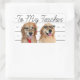 These stickers feature a photograph of two smiling golden retriever dogs who are wearing ties and nerd glasses. The background is a sheet of loose leaf paper with the words, "To My Teacher" written in cursive handwriting.