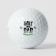 Custom personalized golf balls with the saying 'Golf Dad ' in black typography. The 'o' in the word golf has a black hat above it and there's a black mustache in the phrase between the words golf and dad. In green typography are your first and last initials along with a name on the bottom all of which can be edited . Add your first initial on the left, your last initial on the right and your own name on the bottom.